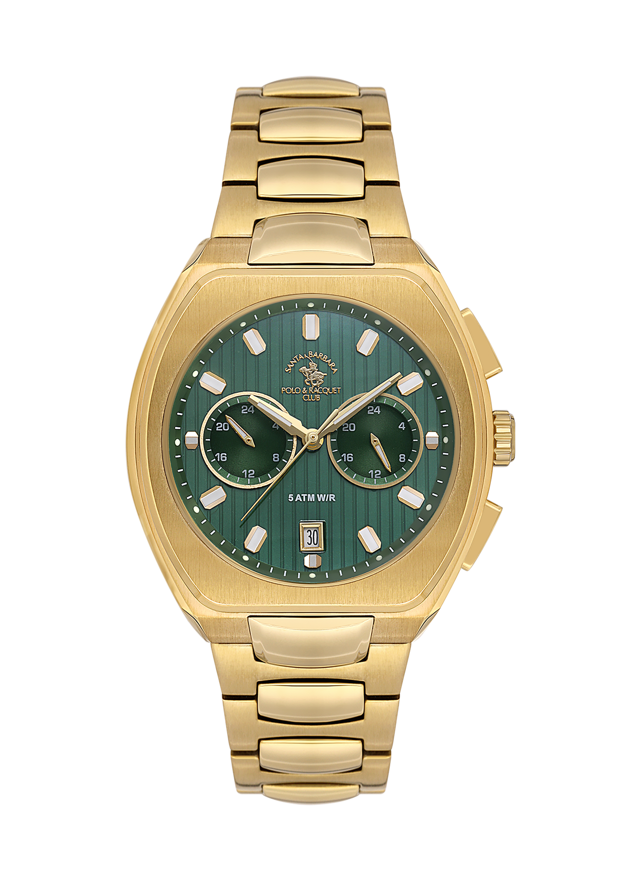 Upgrade your accessory collection with this analog watch from the house of SANTA BARBARA POLO. The Green Dial and Gold Metal Band of this watch for Men offer high quality as well as lightweight feel. Designed to perfection, this watch will go well with formals and casuals too.