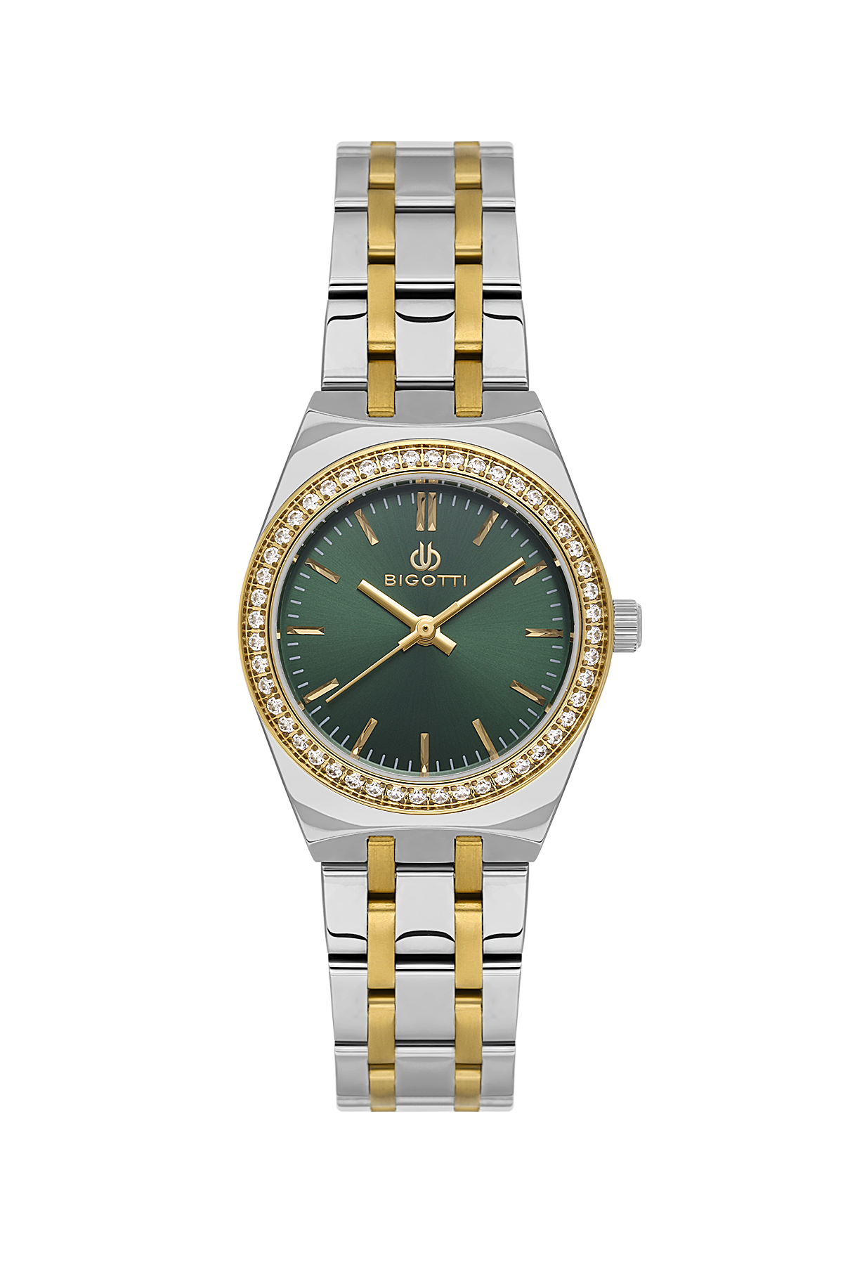 Upgrade your accessory collection with this analog watch from the house of Bigotti Milano. The Green dial and Silver & Gold Metal Band of this watch for Women offer high quality as well as lightweight feel. Designed to perfection, this watch will go well with formals and casuals too.